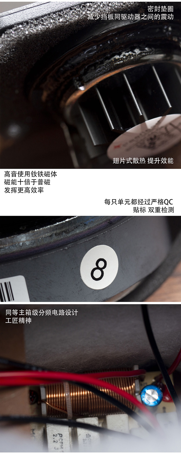 高音单元采用了丹麦VIFA的1英寸软球顶高音单元,该单元采用轻质铜包铝音圈线,具备更低的等效振动质量,可以取得优秀的瞬态和高灵敏度。该单元采用航天工业低黏度磁液冷却,具备更平滑的频率响应和更高承受功率。