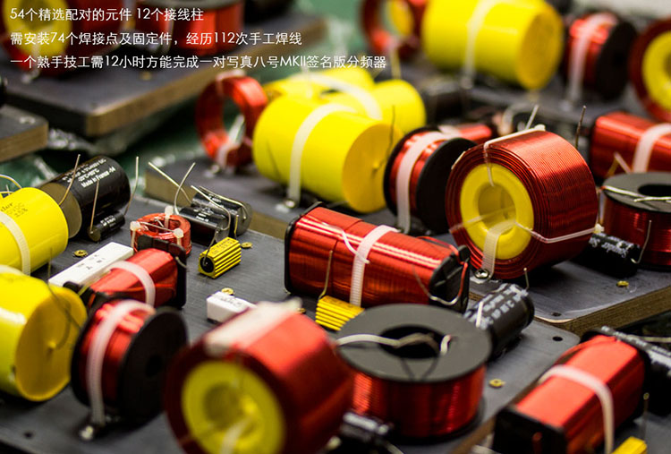 写真八号MKII签名版采用三路三分频,设计了相位校正网络和RLC谐振回路控制单元的谐振峰,◆高阶分频器有较宽的动态范围和较低的互调失真;当然会有更高的成本和设计难度,所以大部分厂家都不会采用,惠普音响在Hi-End级产品上当然不会吝啬,至于设计难度,也不是问题。◆惠普采用计算机辅助设计分频器为指导,所有用料都经过严格的检测和配对。◆写真八号MKII签名版分频器可谓是用尽猛料,法国SOLEN聚丙稀金属化无感电容和粗线径、无氧铜空芯线圈(线圈为厂方自产,可控制到电感数值准确无误),电阻采用优质金属膜电阻。◆所有元件分频器更采用点对点搭棚焊接,采用优质含银焊锡,并用铜螺丝固定。◆另外由于减少了连接线而使信号损失更小,再配以特别定制的发烧喇叭连接线,更有利于提高各频段的分析力。◆六个粗大的纯铜镀金进口CMC接线端子,构成了三线分音线路输出形式,以满足更发烧的三线分音玩法。
